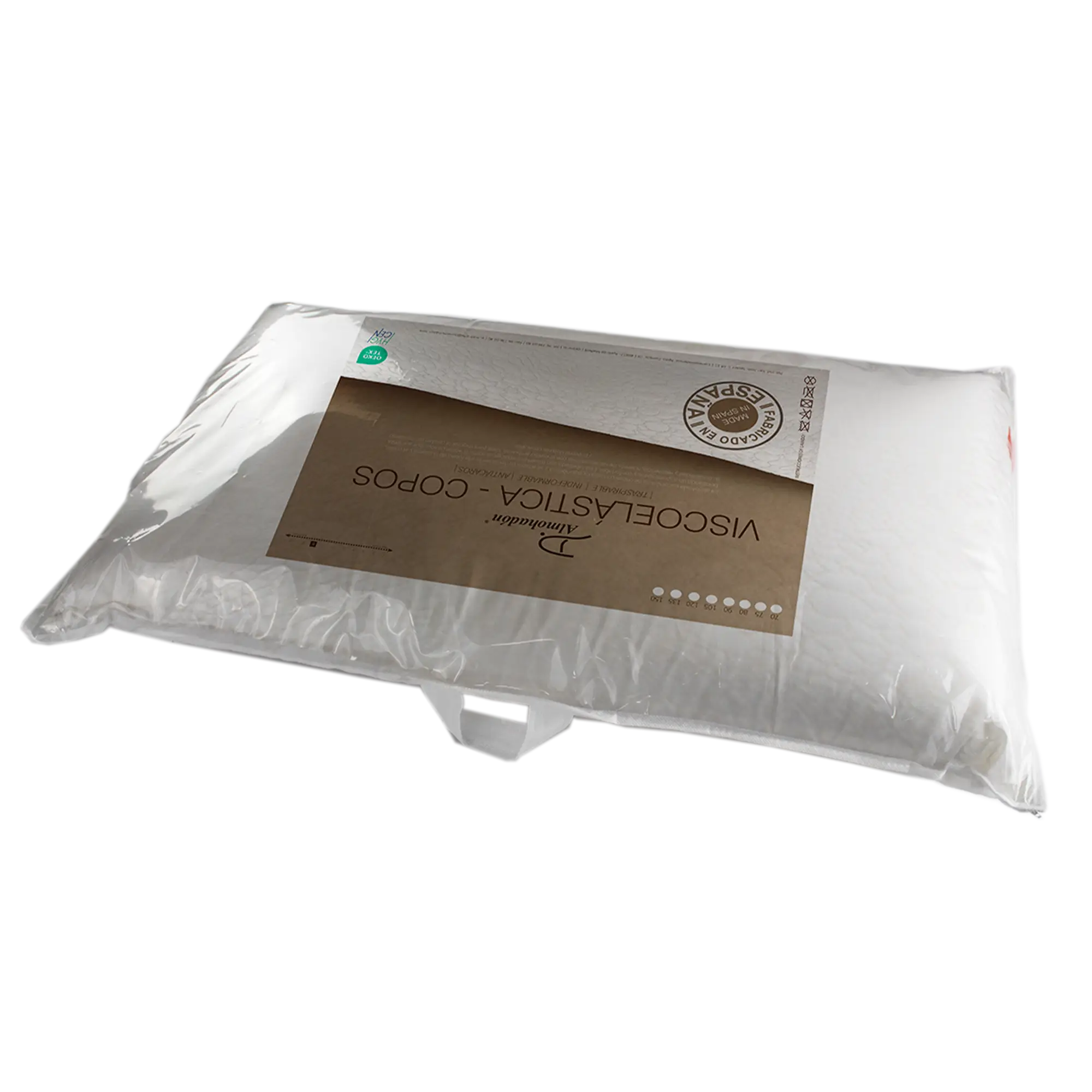 Almohada fabricada con copos de viscoelástica. Producto no nocivo para la salud y el medio ambiente, con certificado HYG CEN. Proporciona una perfecta circulación del aire y a su vez facilita la perfecta adaptación de cabeza y cuello en una posición alta de descanso. Firmeza alta.